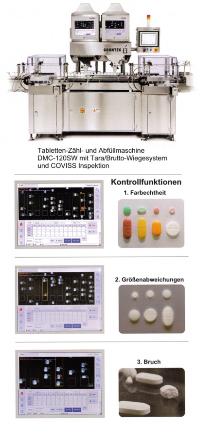 Tabletten-Zähl- und Abfüllmaschinen COUNTEC DMC-60 und DMC-120 Moderne vollautomatische, fomatteilfreie, elektronische Zählsysteme zum Verarbeiten von Tabletten Dragées, sowie Hart- und Weichgelatinekapseln. Die Produktzufuhr erfolgt mittels 12 (DMC-60S)-, bzw.24 (DMC-120)- bahniger Vibrationsstrecke. Das Modell DMC 60 ist auch mit überbreitem Transportband und 2 Füllstellen als Modell DMC-60T lieferbar. Vorteil: Bessere Ausnutzung des Zählvermögens bei kleineren Füllmengen. Hier einige Merkmale: